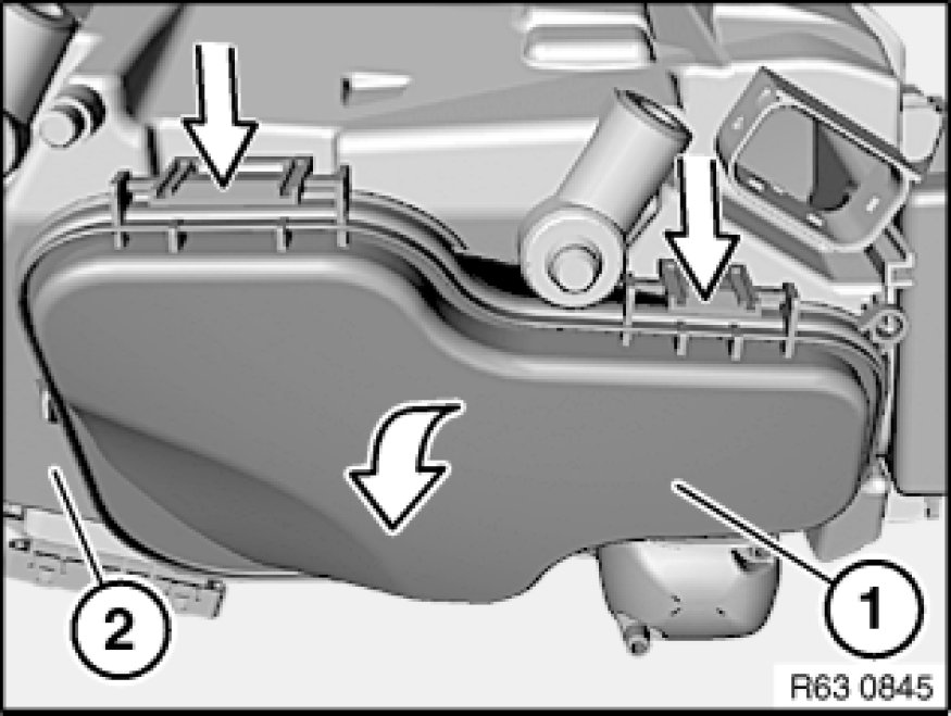 Unlock both retaining tabs and remove cover (1) in direction of arrow from headlight (2).