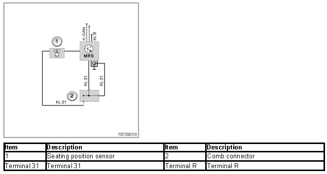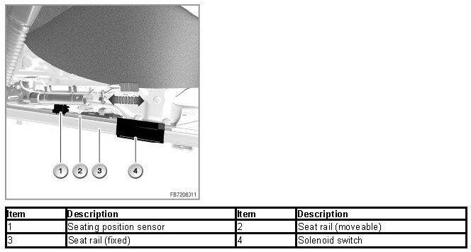 The seating position sensor is a Hall sensor and it is supplied with voltage via the ACSM control unit. The current intensity changes depending on the distance of the seat position switch to the magnet holder.