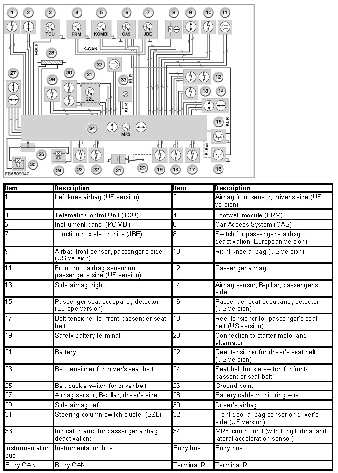 The airbag warning lamp indicates the proper functioning of the multiple restraint system. The airbag warning lamp in the instrument panel is activated by the MRS control unit via the K-CAN.