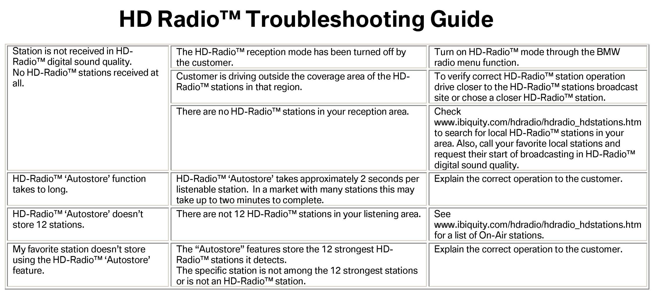 1. Verify the customer complaint and attempt to duplicate the problem. Find out if the problem occurs on AM band, FM band or both. Refer to the attached HD radio(TM) Troubleshooting Guide (updated).