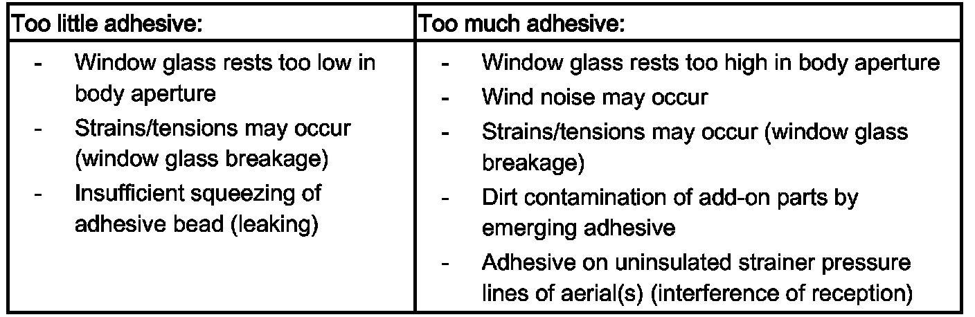 The adhesive bead may become up to 15 mm wide in compressed condition. The width of the adhesion agent is therefore at least 17mm with windscreens and rear windows and at least 9mm with door window glass.