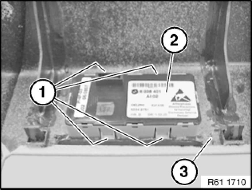 Unlock retaining hooks (1) and press seat adjustment switch (2) out of rear panel (3).