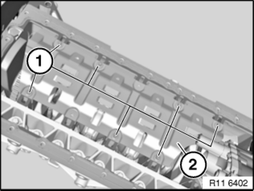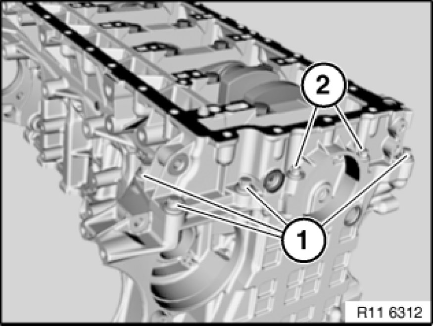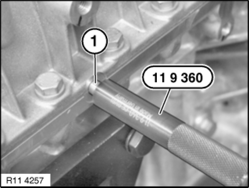 Drive in both nozzles (1) with special tool 11 9 360 11 9 360 Drift on left and right into crankcase.