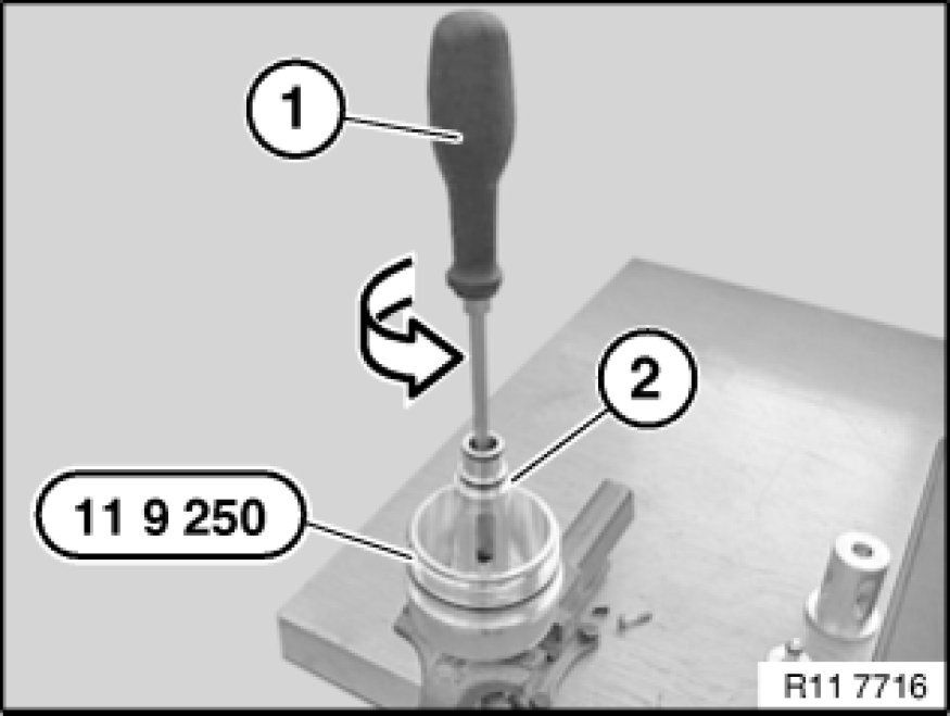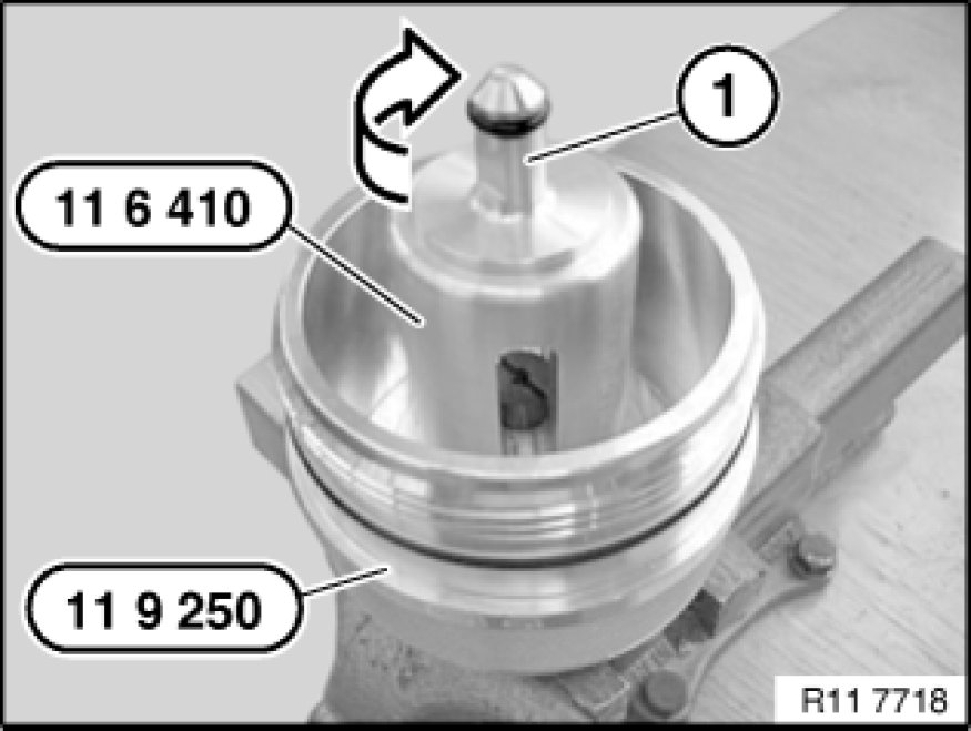 Insert screw piece (1) hand-tight in direction of arrow on special tool 11 6 410 11 6 410 Adapter.