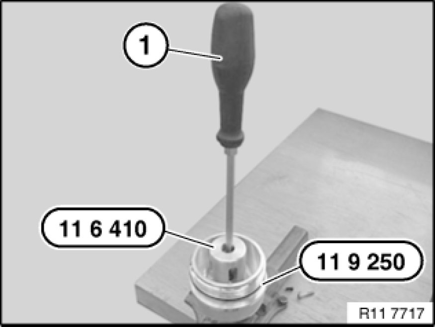 Release screw piece (1) on special tool 11 6 410 11 6 410 Adapter.
