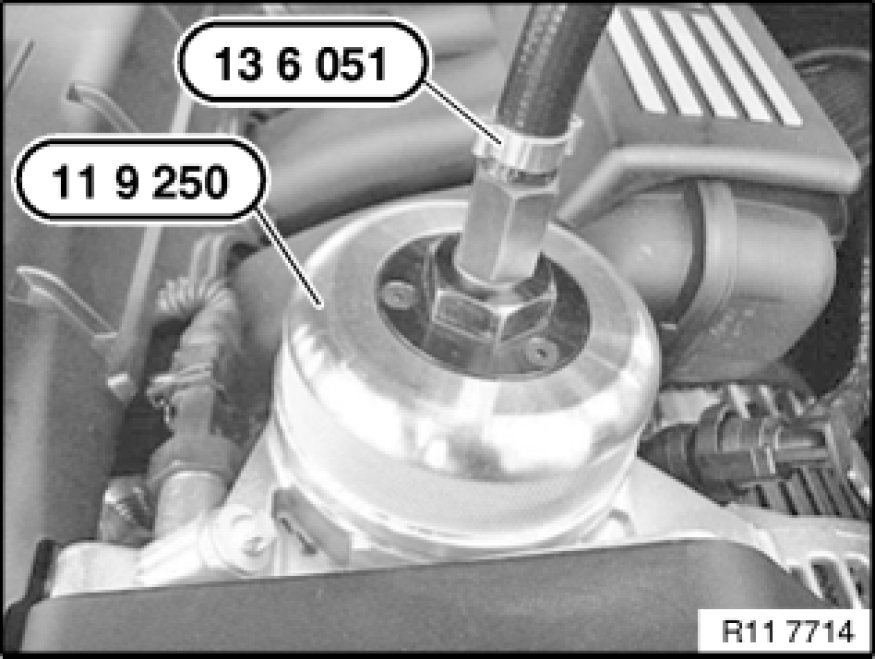 Install filter element (1) in special tool 11 9 250.