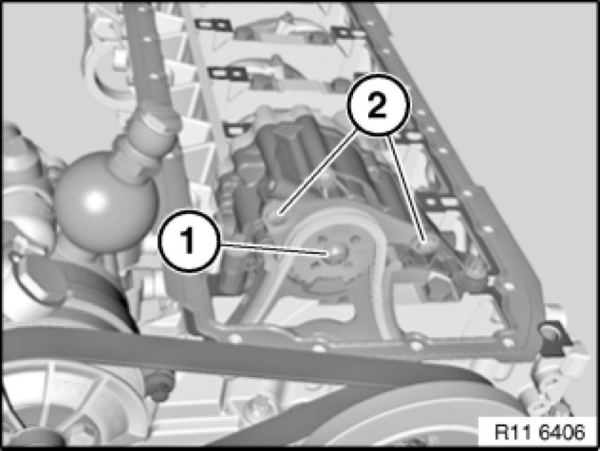 To release bolt (1), insert a 6 mm drill bit between sprocket wheel and oil pump housing.