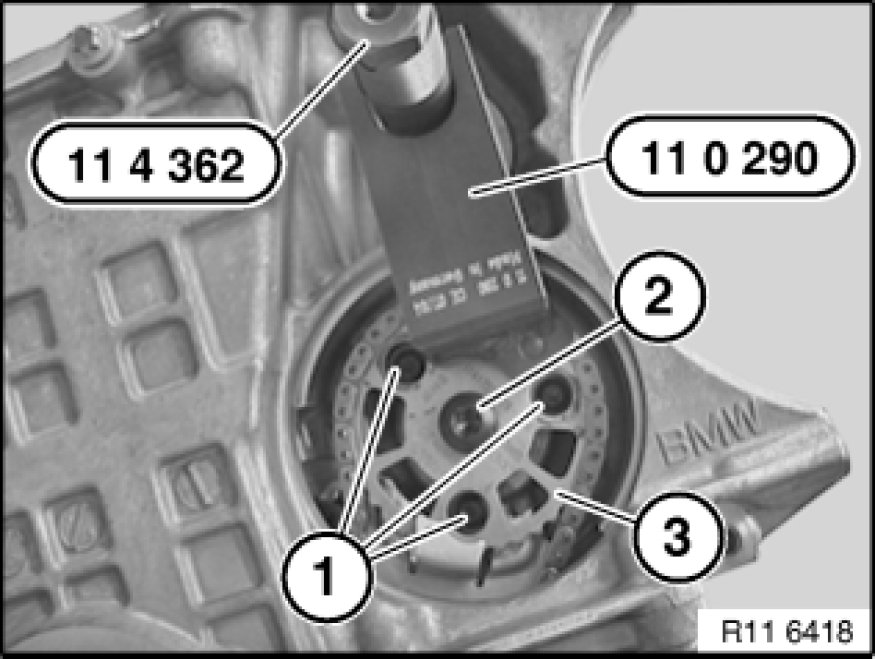 Simultaneously secure special tool 11 0 290 11 0 290 Holder to sprocket wheel (3) and special tool 11 4 362.