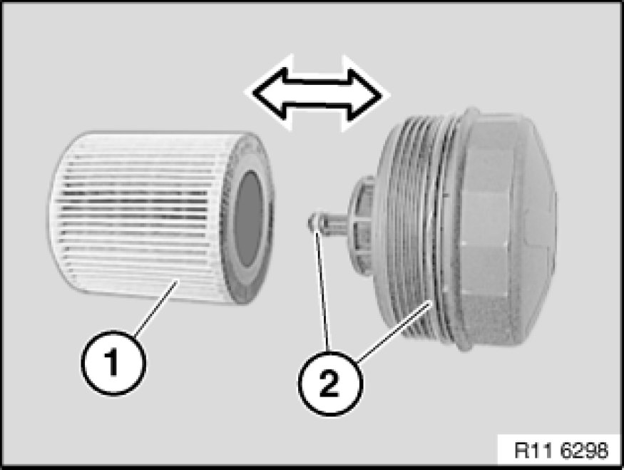 Remove and insert oil filter element (1) in direction of arrow.