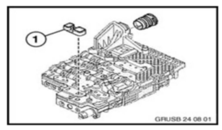3. If the initial transmission fluid level was correct, or the fault codes listed above returned after topping up and test-driving, remove the transmissions's Mechatronic and check its adapter seal (black, rectangular shaped) for cracks. Refer to REP 24 34 561 for instructions on removal and reinstallation of the Mechatronic. IMPORTANT: