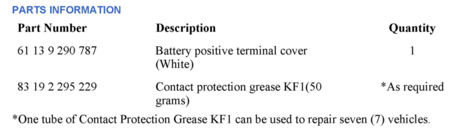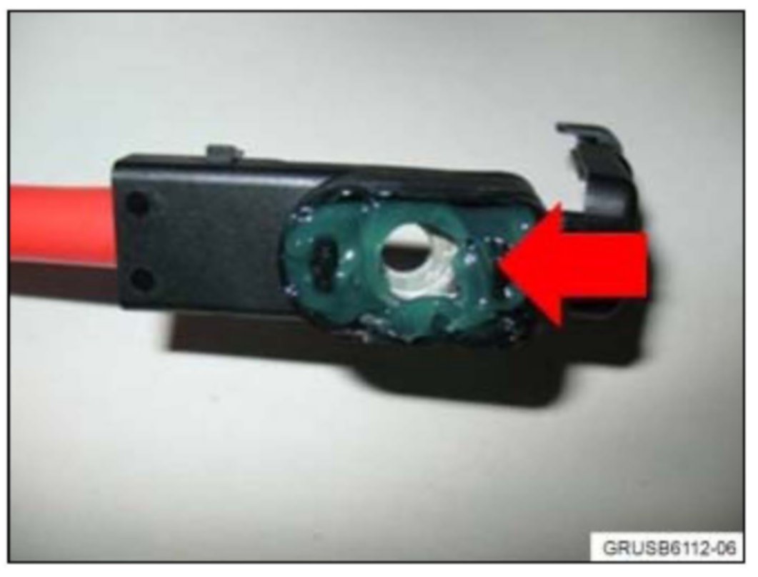 9. Ensure that the cable is clean before assembly. Install the new battery positive terminal cover (the new cover is white in color) and coat the bottom area, as shown, with contact protection grease.