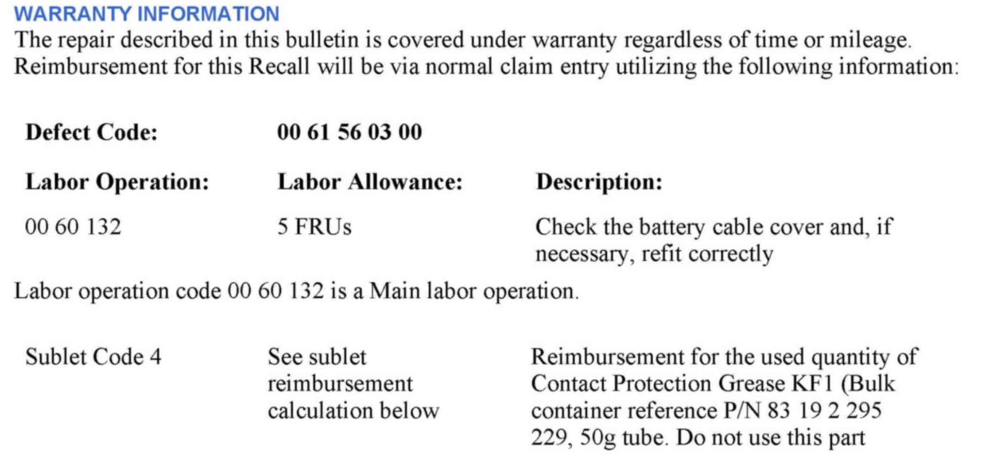 In the unlikely event other damage (for example: thermal damage to the trunk trim and damage or corrosion to the cable connection) is found that is directly related to the condition described in this recall, the vehicle owner must not be billed for this additional work (parts and/or labor).