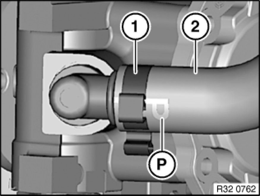 Align suction line (2) by way of marking (P) to connection on vane pump.