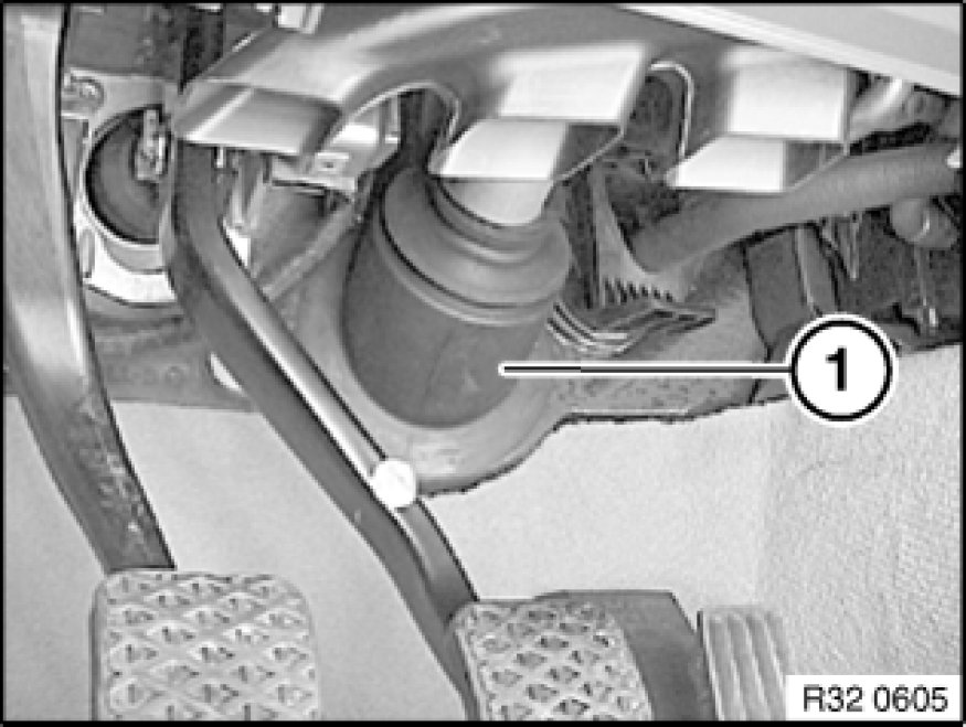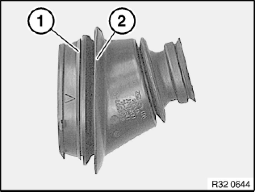 To prevent the sleeve from slipping out and to avoid complaints by the customer about noise, make sure that sealing lip (1) on engine compartment side rests against bulkhead all round and sealing lip (2) in inside the car rests against the damping.