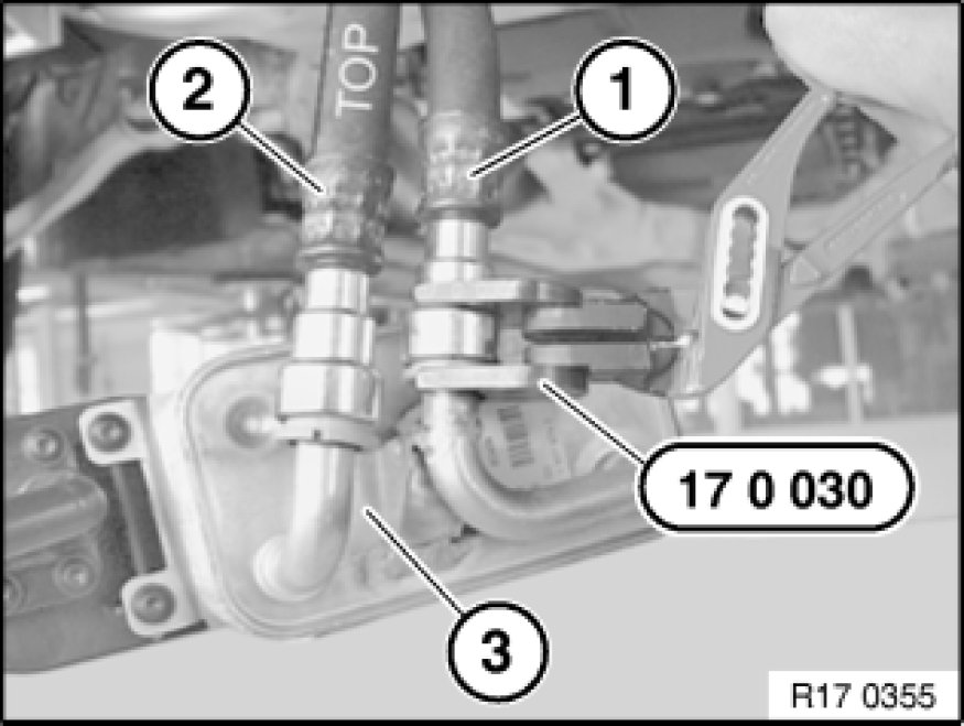 Unlock hydraulic lines (1 and 2) on heat exchanger (3) with special tool 17 0 030 17 0 030 Pliers and disconnect.