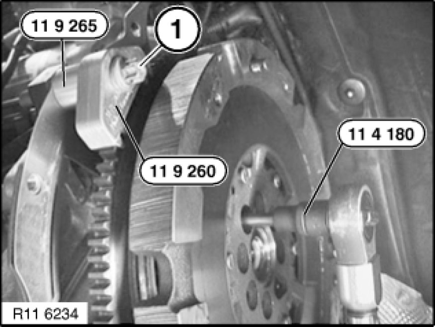 Secure flywheel with existing transmission bolt (1) and special tools 11 9 260 and 11 9 265.