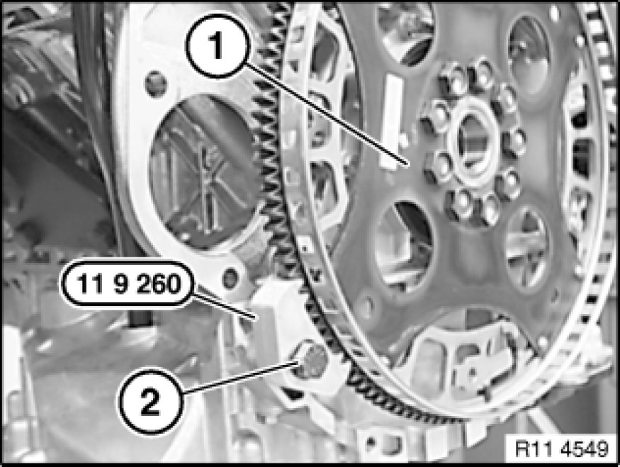 Secure flywheel (1) with existing transmission bolt (2) and special tool 11 9 260.