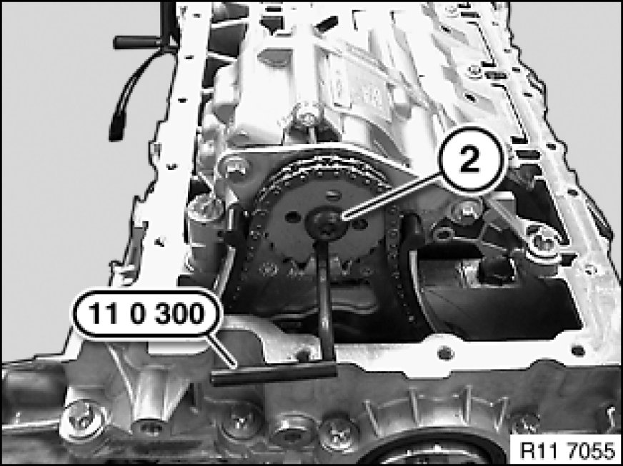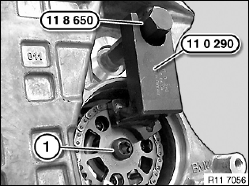 Position special tool 11 0 290 11 0 290 Holder on sprocket wheel and on special tool 11 8 650 11 8 650 Holder.