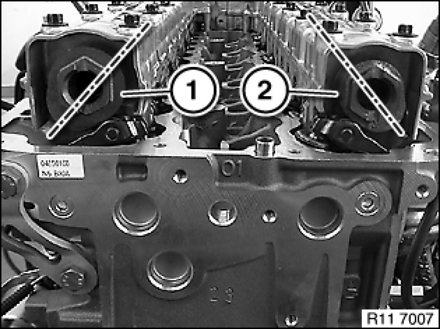 With cylinder no. 1 in firing TDC position, inlet camshaft (1) at cylinder no. 6 points downwards at an angle to the left.