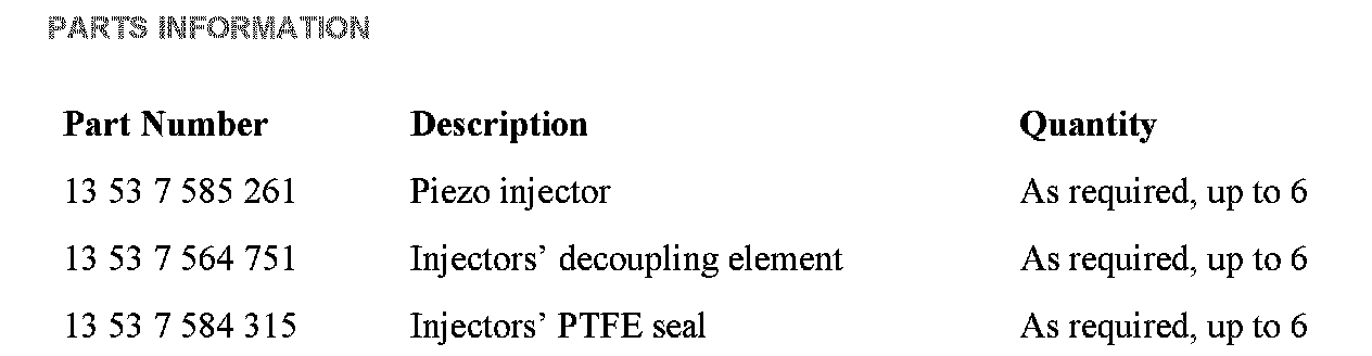 Injectors identified as "OK" (green field) should NOT be replaced, but they should be reinstalled into corresponding cylinders after replacement of the PTFE Sealing ring (P/N 13 53 7 584 315) and decoupling element (P/N 13 53 7 564 751), following REP 13 53 310.