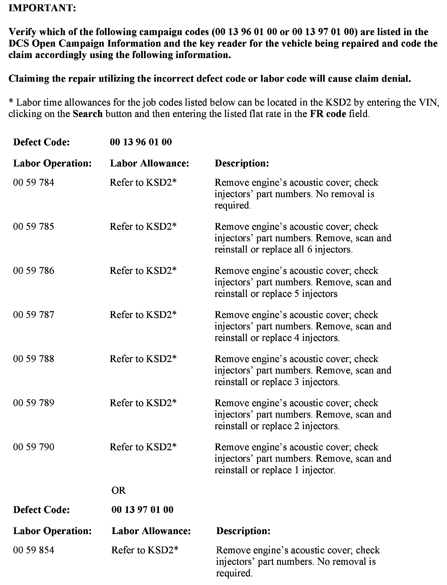 In order to determine whether a specific vehicle has had this Emissions Recall Campaign completed or is affected by this Recall Campaign, it will be necessary to utilize the "Service Menu" of DCSnet (Dealer Communication System) or the Key Reader. Based on the response of the system, either proceed with the corrective action or take no further action.