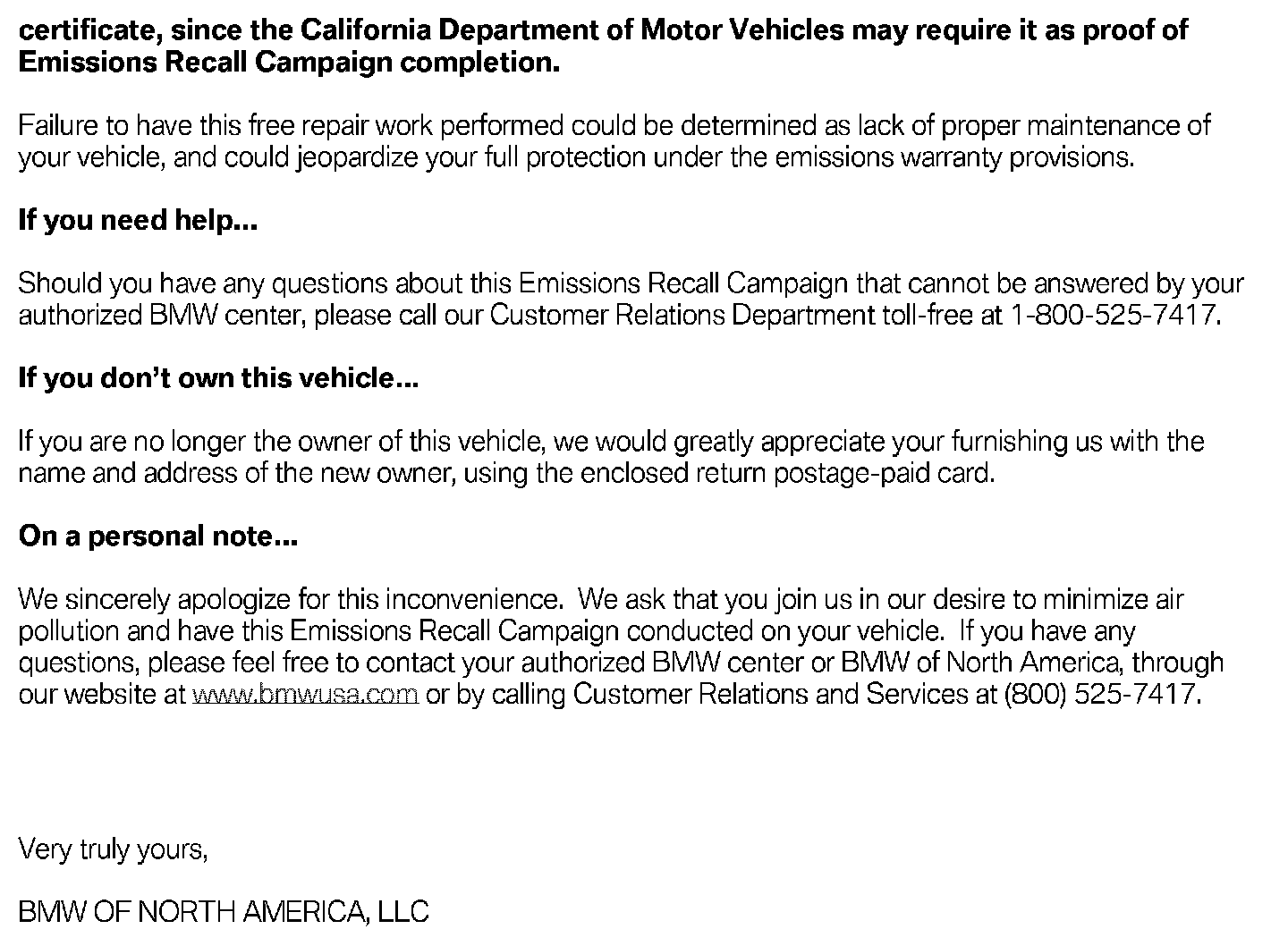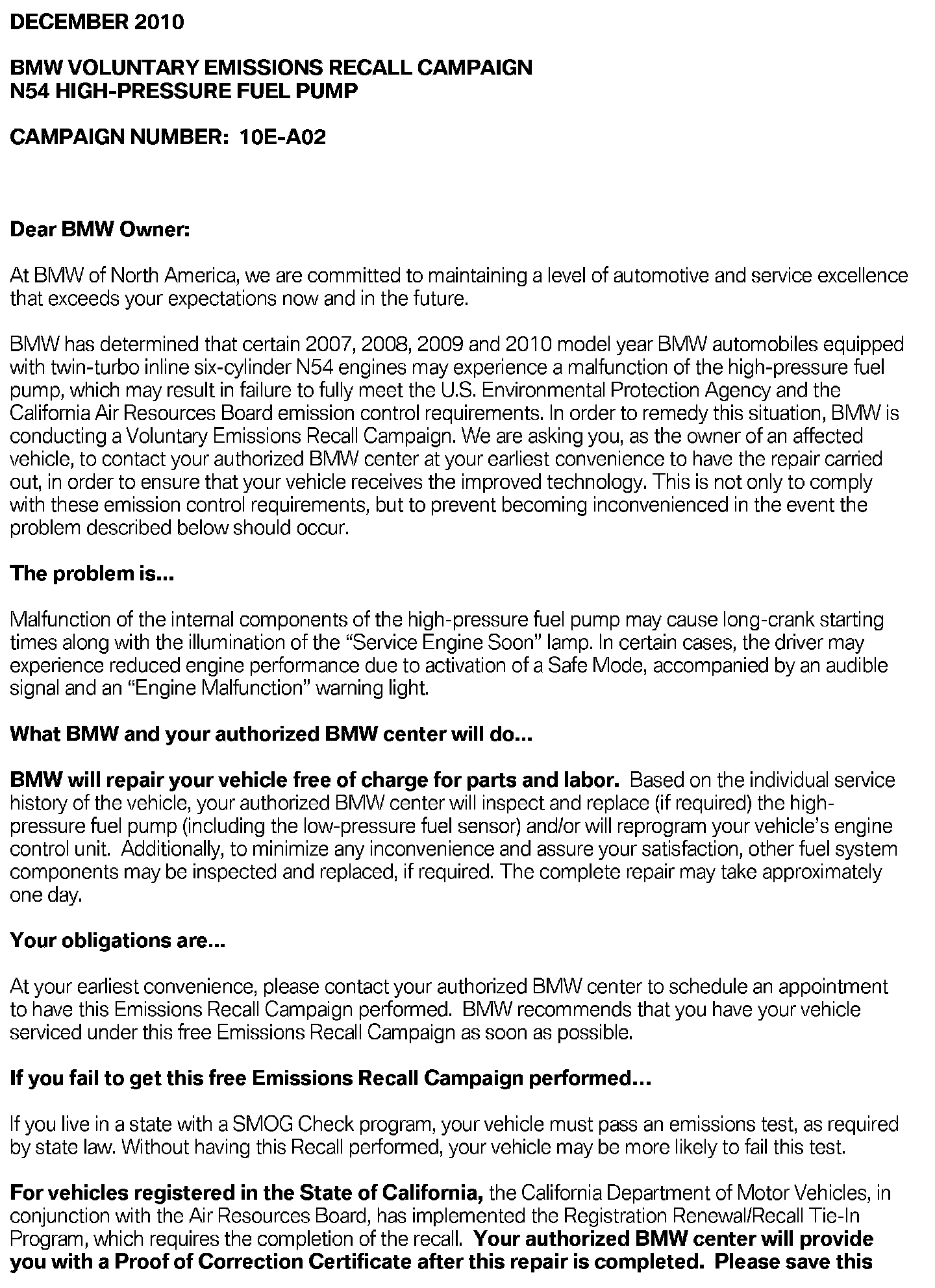 Voluntary Emissions Recall Campaign 10E-A02: N54 Inspection and Replacement of Injectors