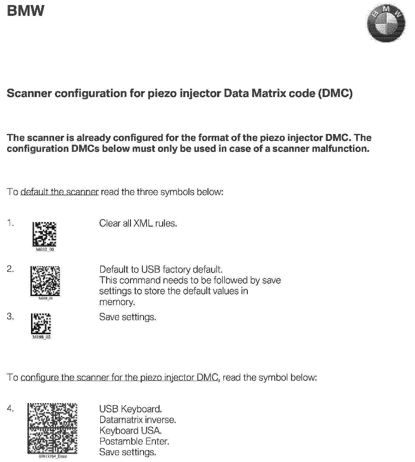 Connect the scanner to the USB port of the workshop's PC. Using the attached configuration sheet; scan all 4 bar code symbols. Audible signals after each scanning would indicate correct readout of the scanner. Once successfully completed, configuration does not need to be repeated.