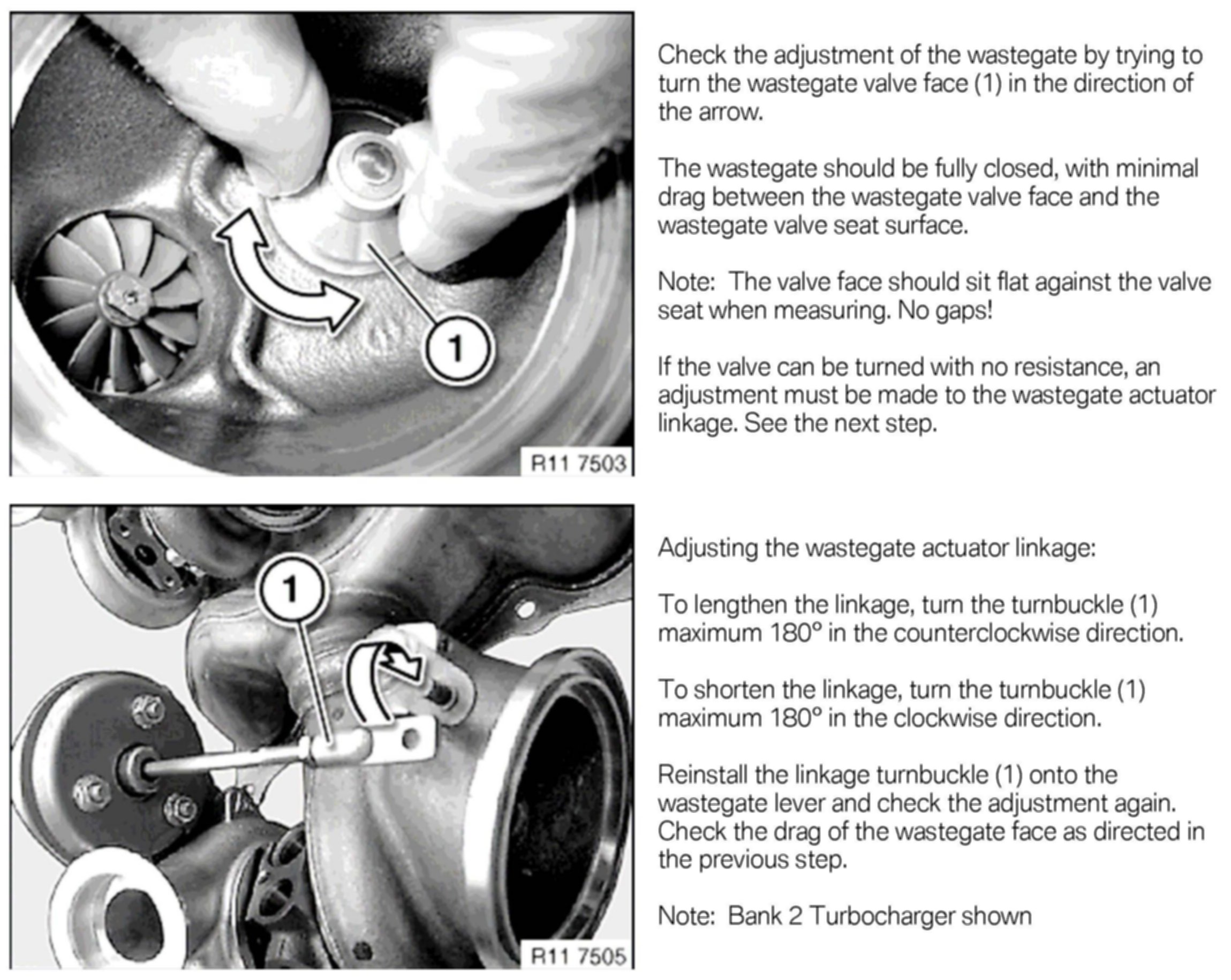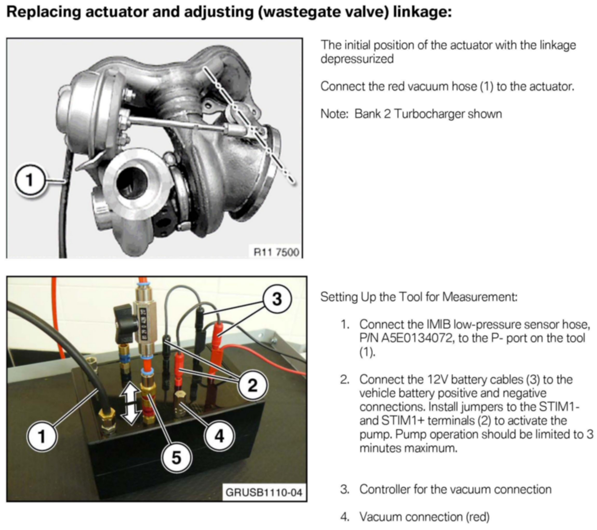 The current version of Repair Instruction REP 11 65 580, Replacing the wastegate vacuum unit (N54 and N54T), describes using the 100-bar pressure transducer with GT1 or DIS Plus (2G) equipment. Attached is a repair instruction supplement describing procedures for adjusting and replacing the wastegate actuator, using the ISID, IMIB and the low-pressure measurement features.