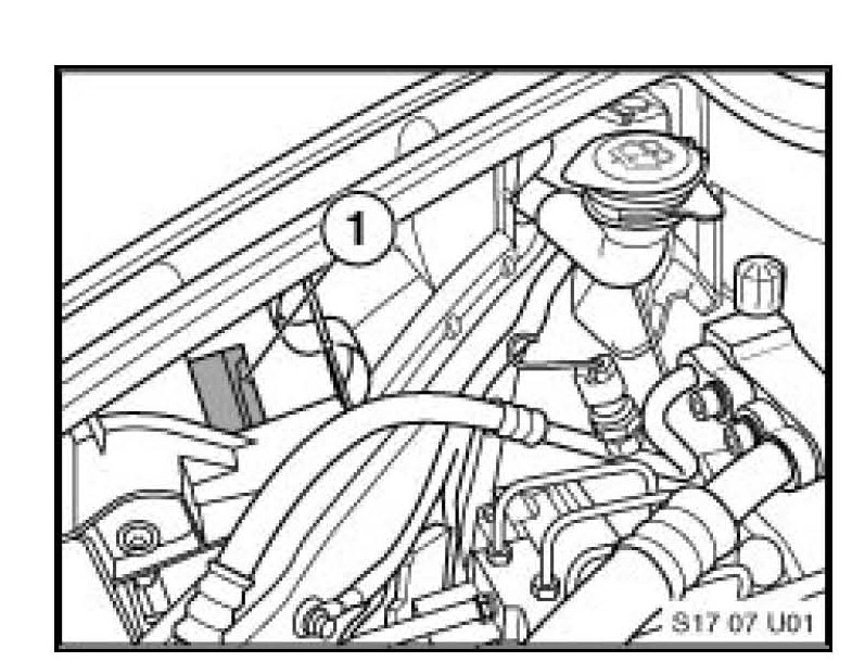 Coolant fan power supply relay K9137 (1) is located behind front, right fender, close to DSC module. In order to gain access to relay's harness, the wheel well cover has to be removed.