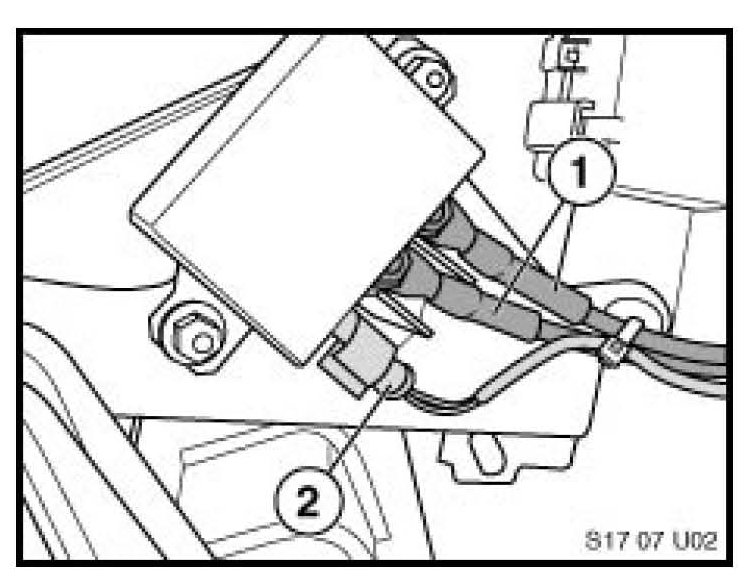activation (KL30g from the rear fuse box/power distribution box and local ground KL31). Threaded connectors (1) are input and output for B+.