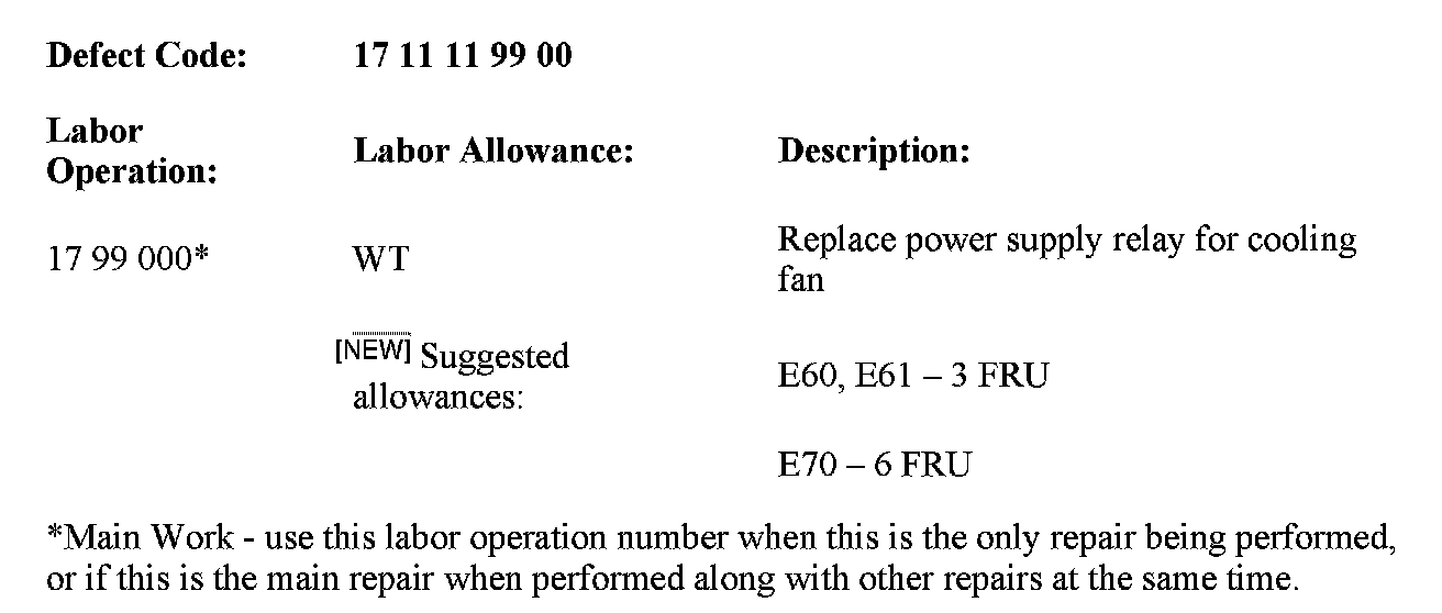 On a customer complaint basis only, perform diagnosis with DIS/GT1 and work through the corresponding test modules. Additional diagnostic hints can be found in SI B17 02 07 ("E70, E60 - Diagnostic of Electric Cooling Fan" from 09/2008).