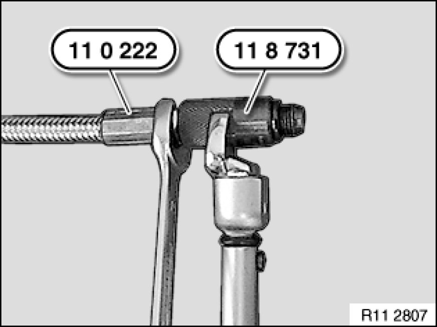 Screw special tool 11 0 222 into special tool 11 8 731 11 8 730 Adapter to 10 Nm.