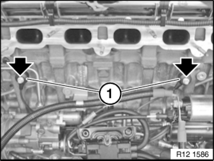 Release screws on both knock sensors (1) and remove knock sensors (1).