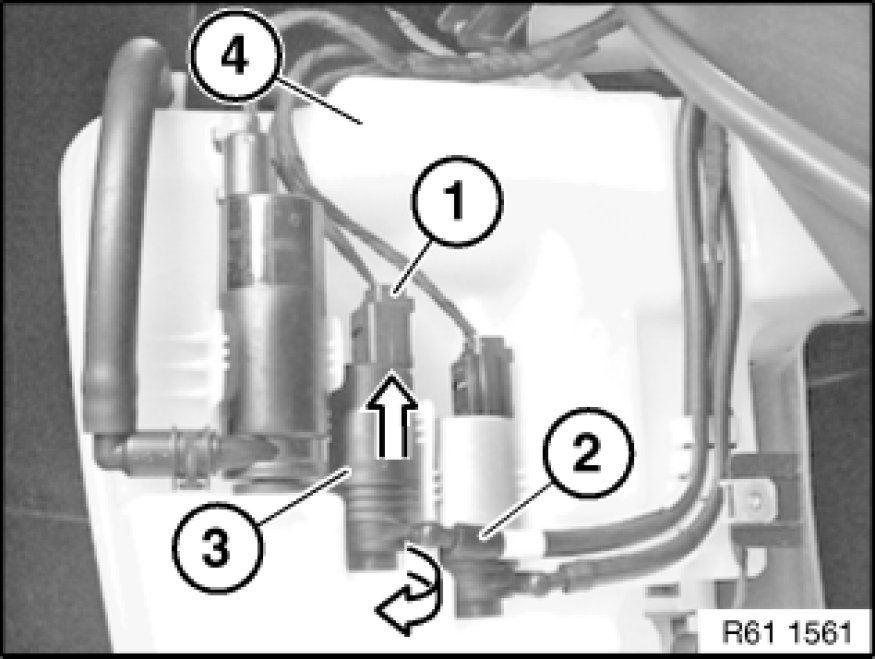 Turn washer pump for rear window washer unit (3) and pull in direction of arrow out of fluid reservoir for windscreen washer unit (4).