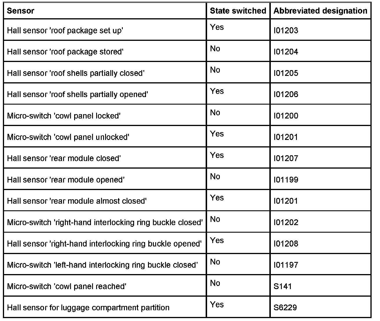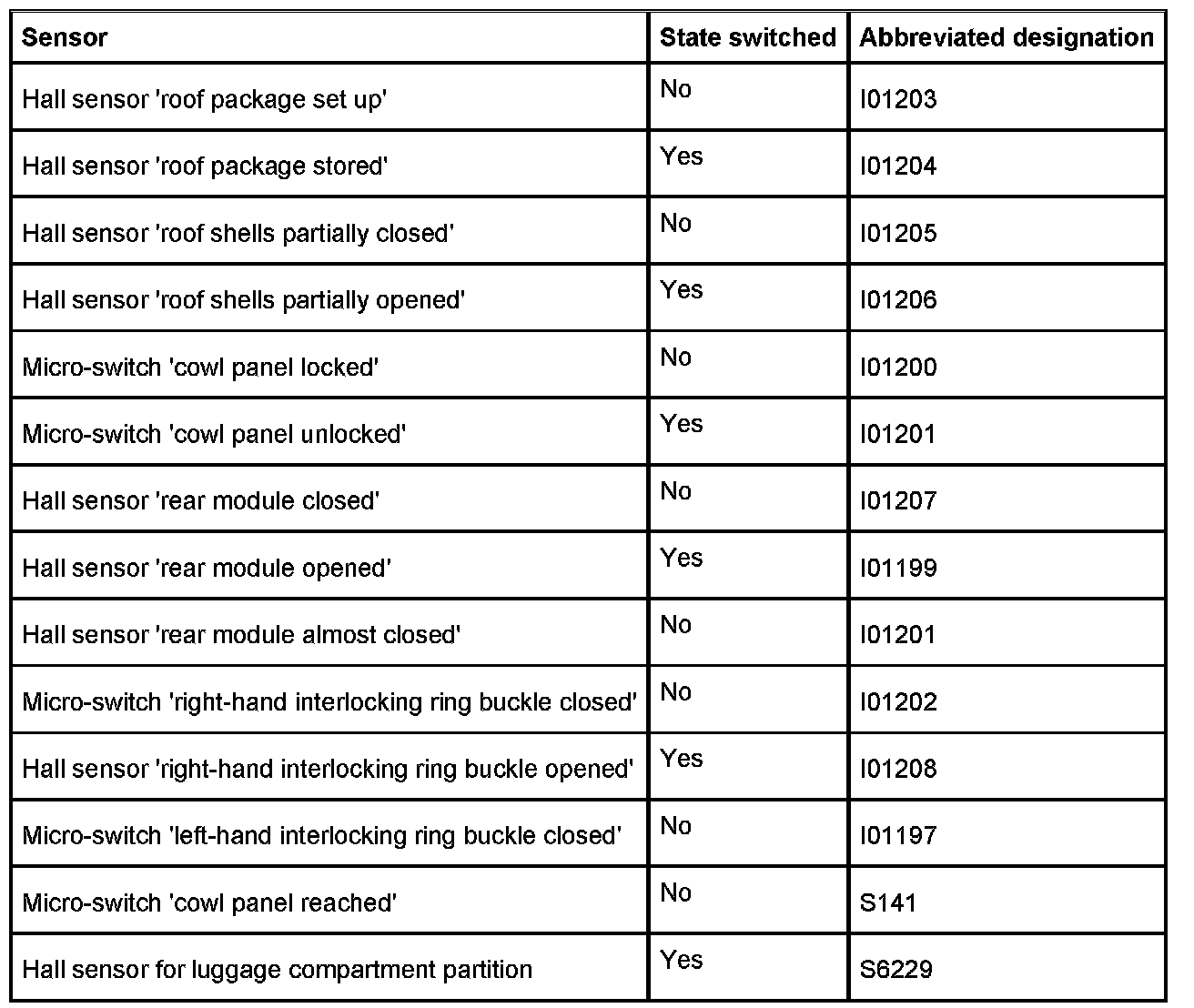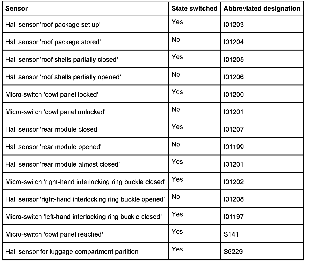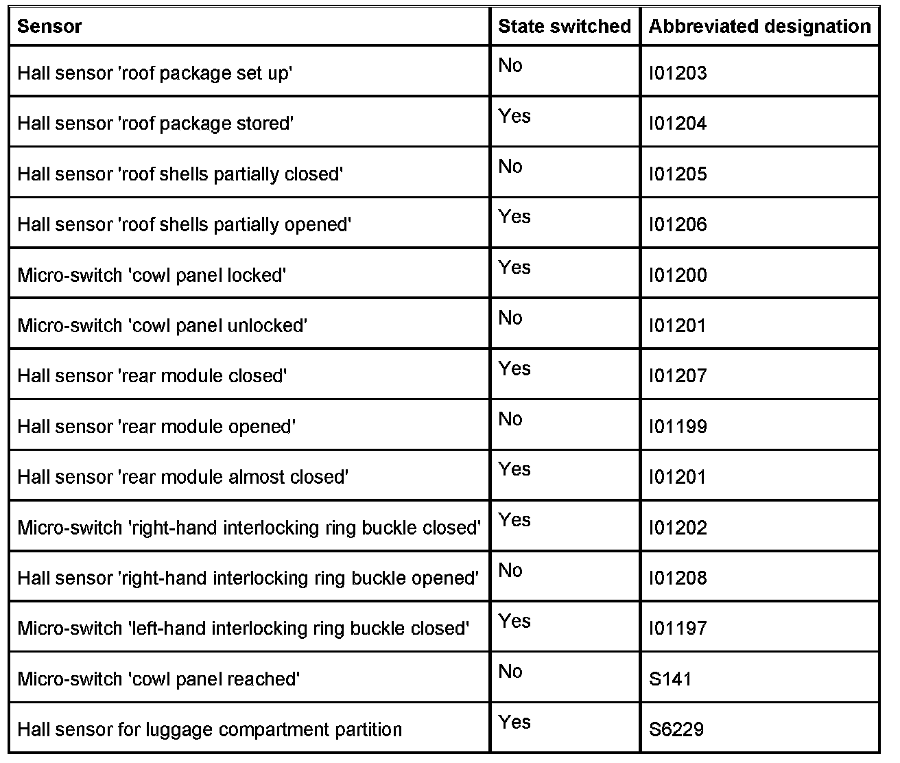 There are a total of 14 sensors for the retractable hardtop (9 Hall sensors and 5 micro-switches). These sensors detect the different positions on closing and/or opening the hardtop. To pinpoint faults, it must be known in which intermediate position the hardtop comes to a standstill. This can be used to conclude what the fault is.