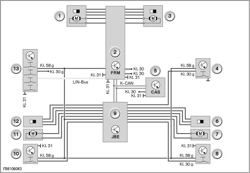 The control modules involved communicate via the data buses in the vehicle. The junction box supplies the control modules with voltage.