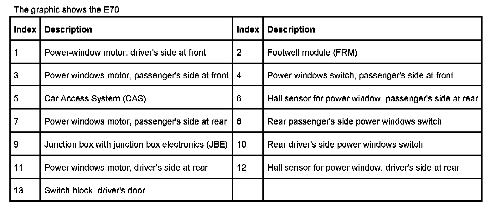 The power window regulator function is implemented by a number of control modules. The footwell module actuates the front power windows. The rear power windows, if fitted, are activated through the junction box electronics.