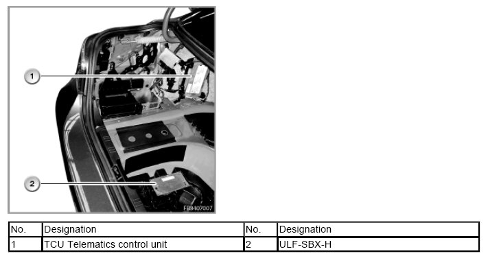The installation location of the TCU Telematic Control Unit and the ULF-SBX-H interface box High is shown below with the E60 as an example.