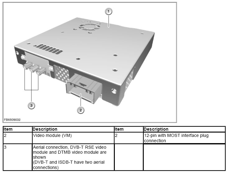 The DTMB video module (Digital Terrestrial Multimedia Broadcast) has one analogue and one digital TV tuner integrated within it (analogue to the DVB-T). The DTMB video module is designed for TV mode while stationary and while driving. In vehicles with a rear seat entertainment system, all three aerials are connected; otherwise, the third aerial input remains open.
