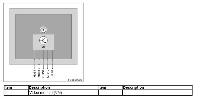 The video module (VM) is connected to the vehicle electrical system and the MOST via a 12-pin plug connection with a MOST interface.
