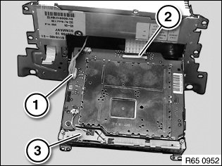Raise lid (1) with special tool 64 1 020 all round and remove from Car Communication Computer (2).