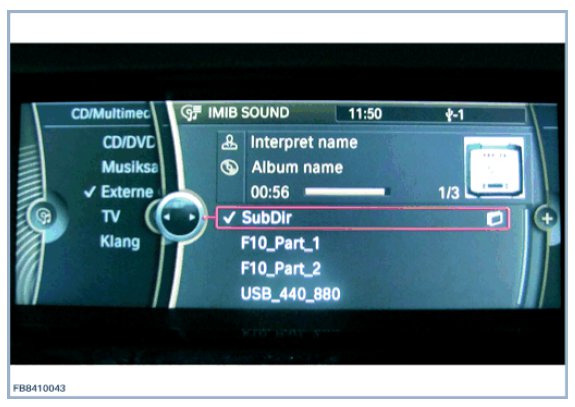 IMIB SOUND must be selected via the controller in order to display and play the music files. Check volume control in vehicle. A total of 3 media files and a sub-directory (SUBDIR) with contents are offered. To find the subdirectory, select IMIB SOUND and then select Browse directories. In vehicle with a Combox, album cover information is displayed in the form of a graphic as well as the media descriptions (genre, album and track).