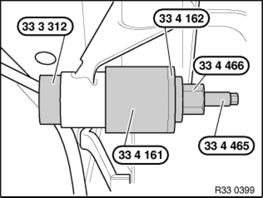 Withdraw front rubber mount with special tools 33 3 312 33 3 310 Removal/Installation Tool Kit, 33 4 161 33 4 160 Removal/Installation Thrust Pieces, 33 4 162 33 4 160 Removal/Installation Thrust Pieces, 33 4 466 and 33 4 465 .