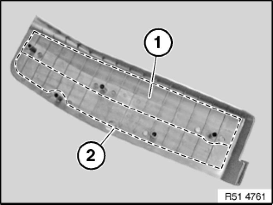 Heat footrest (1) with hot air blower and apply adhesive bead along dashed line (2) with hot-melt adhesive gun.