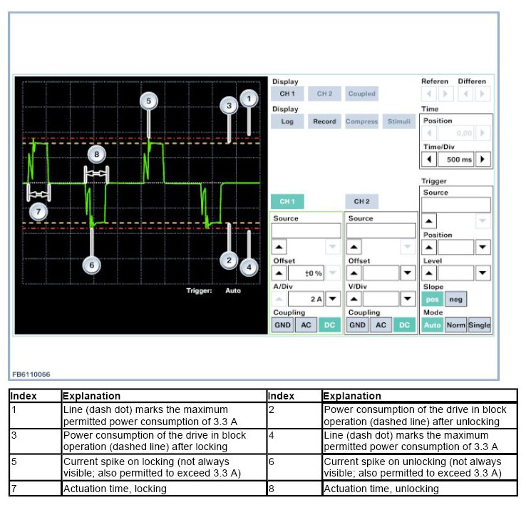 A current spike above 3.3 A on starting the central locking drive is permitted and is the normal operating condition. The central locking drive is activated for 500 ms. A tolerance in the actuation time of ± 50 ms is permitted and the normal operating condition.