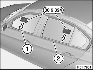 Insert special tool 00 9 324 at rear (at C-pillar) in window cavity (2) (TOP label pointing upwards).