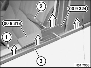 Guide special tools 00 9 324 and 00 9 318 towards front/rear and lever out weather strip (3).