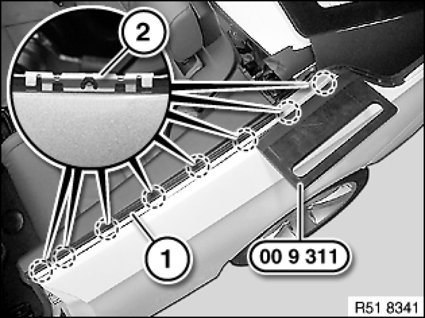 Starting at the rear, carefully lever weatherstrip (1) out of clips (2) on side panel with special tool 00 9 311.