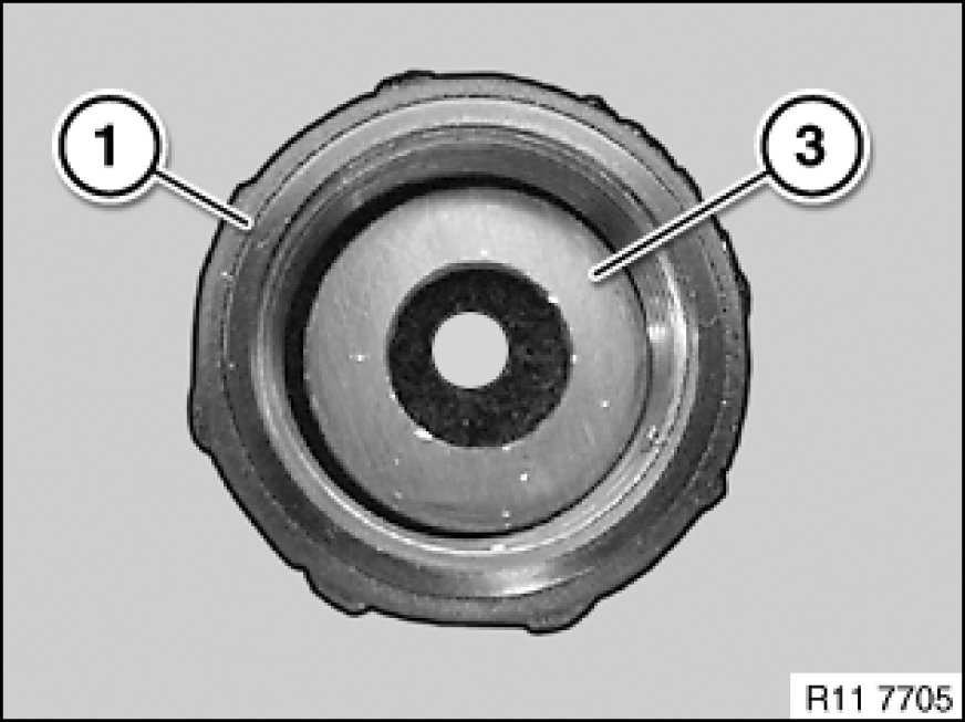 Insert special tool 11 9 952 11 9 950 Fixture with taper facing up in valve cage (1) (see arrow).