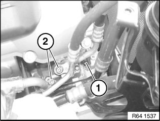 Clamp off overflow hoses (1) and lay to one side.